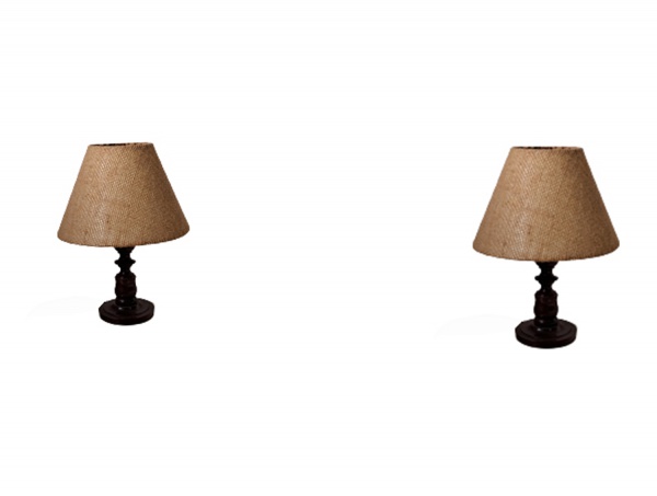 • Par de luminárias de mesa  com haste em madeira e cúpula em juta, Alt.30, Diam. 25 m.