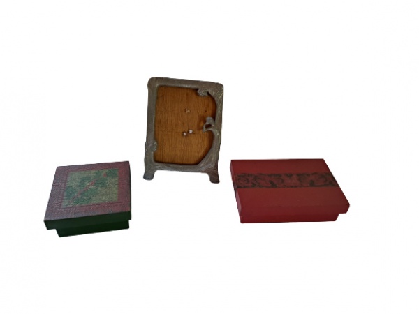 • Diversos, um porta retratos em aço escovado com uma das laterais adornado com escultório representando dama e duas caixas de madeira, 13 x7 -  21 x 4 e 14 x 14 cm.