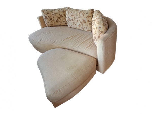 • Sofá para 3 assentos com descanso para os pés em design recurvo com 3 almofadas soltas, o descanso com pequeno desgaste, 194 x 108, Alt. 70 cm. Descanso 80 x 90, Alt. 40 cm.