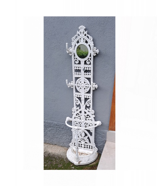 • Chapeleira em fer forget patinado de branco o 4 cabides espelho circular, 50 x 30, Alt. 165