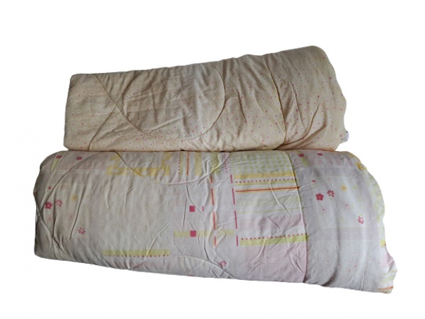 • Dois edredons sendo 1 para casal e outro solteiro, um verde sobre fundo branco e 1 rosa sobre fundo branco.