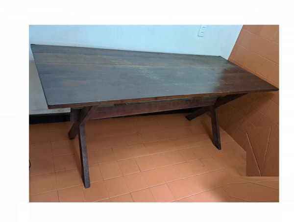 • Mesa cavalete e madeira nobre, tampo reguado, pernas  em `X` arrematadas em trava, 186 x 74, Alt. 76ccm.