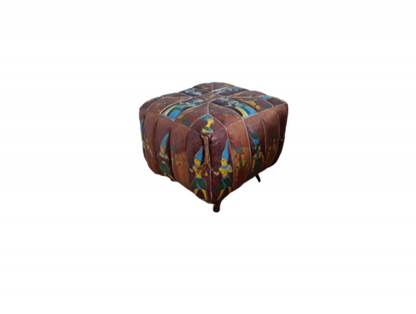 • Pufe executado em couro adornados om pinturas à mão representando egípcios e apoiado em pernas de ferro enferrujadas,  40 x 40, Alt. 37 cm.