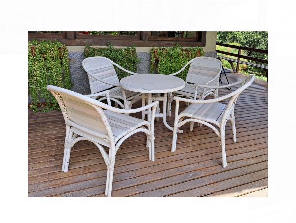 • Mesa circular Tubline com 4 poltronas em plástico duro, com pernas tubulares, com marcas do tempo, Diam. 79, Alt. 70, cadeiras, 67 x 70, Alt. 89 cm.