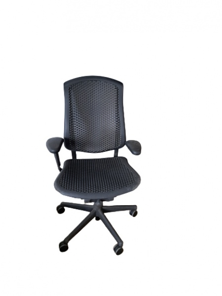 • Cadeira giratório executada em plástico na cor preta, pernas em rodízio, altura regulável, com marcas de uso,  57 x 58, Alt.  Mínima  100 cm.