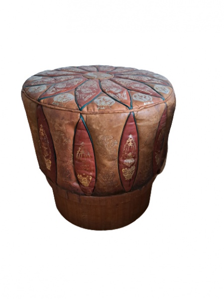 • Pufe executado em couro com pinturas à mão representando  egípcios Diam. 48, Alt. 49 cm. apoiado e base de madeira, o couro apresenta desgastes,