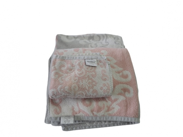 • Kit toalhas sendo 2 de banho e 1 de rosto Storehouse na cor rosa e cinza com leves manchas.