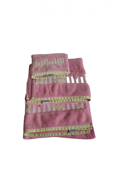 • Kit toalhas sendo 2 de banho e 1 de rosto Bouquet na cor rosa com bainha de flores.