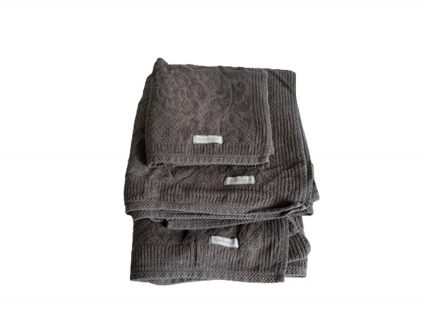 • Kit toalhas sendo 2 de banho e 1 de rosto Budmmeyer na cor grafite, apresenta manchas e bainha desfeita.