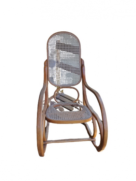 • Cadeira de balanço Thoné executada em madeira nobre, encosto  assento em palhinha sendo que assento inutilizado, arranhões nas penas traseiras e algumas partes da madeira descoladas e uma parte faltante, 54 x 90, Alt. 103 cm.