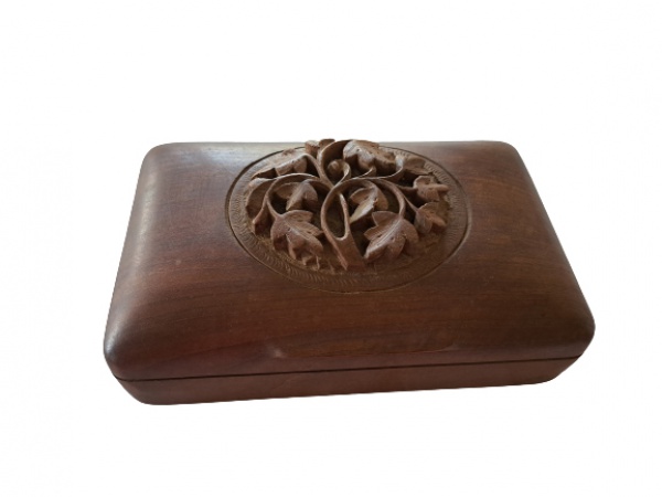 • COLECIONISO - Caixa executada em madeira, tampo ornamentada com medalhão em alto relevo, interior com 2 repartições, 20 x 13, Alt. 7 cm.