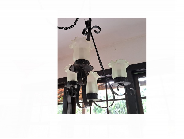 • Luminária de teto para 4 luzes em fer forget  braços recurvos e mangas com bordas babadas, Alt. 65, Diam. 56 cm.
