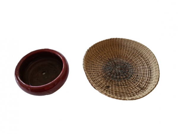 • Cachepot em cerâmica na cor vinho e uma bandeja em palha, fundo manchado.  Diam. 24 e 39 cm.