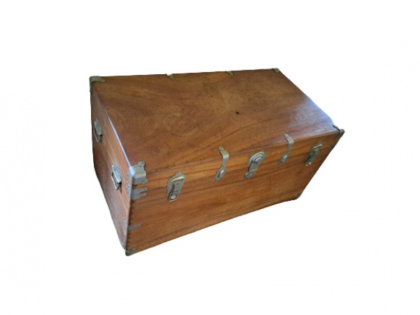 • Baú executado em madeira dobradiças acabamentos e fecho em aço com  chave original,106 x 59, Alt. 55 cm.