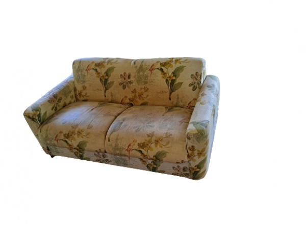 • Sofá para dois assentos estofado com tecido floral e pássaros, almofadas precisando de higienização, 83 x 156, Alt. 73 cm.