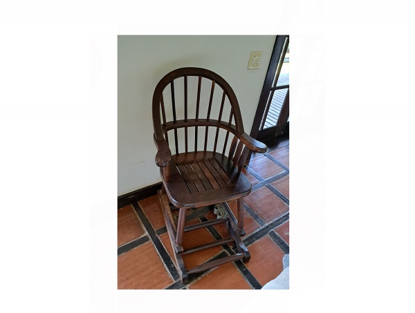 • Cadeira de balanço com mola em madeira nobre, braços e encosto recurvo, braço  arranhado,  60 x 69, Alt. 94 cm.