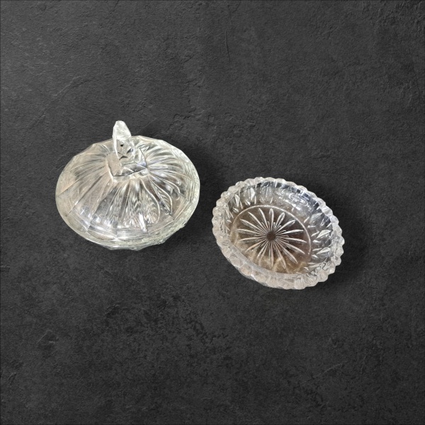 • Bombonière e um cinzeiro em cristal lapidado, ponteira com leve bicado, Diam. 16, e 15, Alt. 16 e 3 cm.