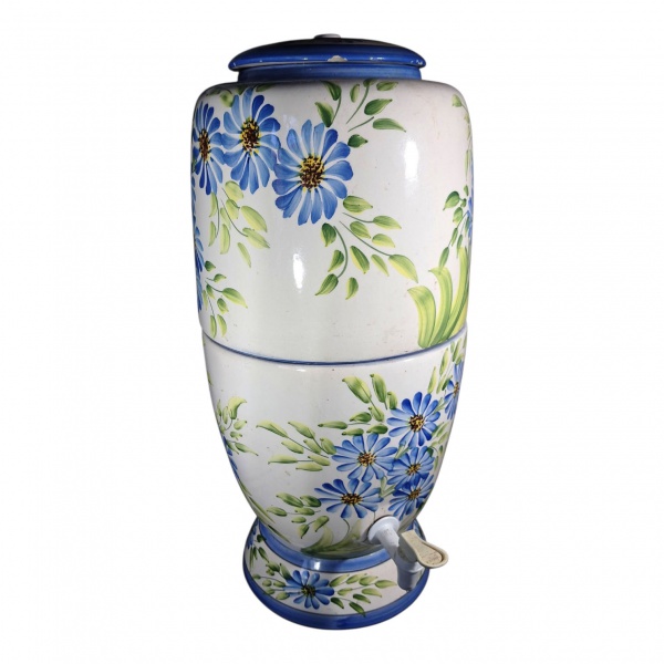 • Talha/Filtro em cerâmica policromado representando margaridas sobre fundo creme e frisos azuis, apresenta vários bicados, Diam. 23, Alt. 48 cm.