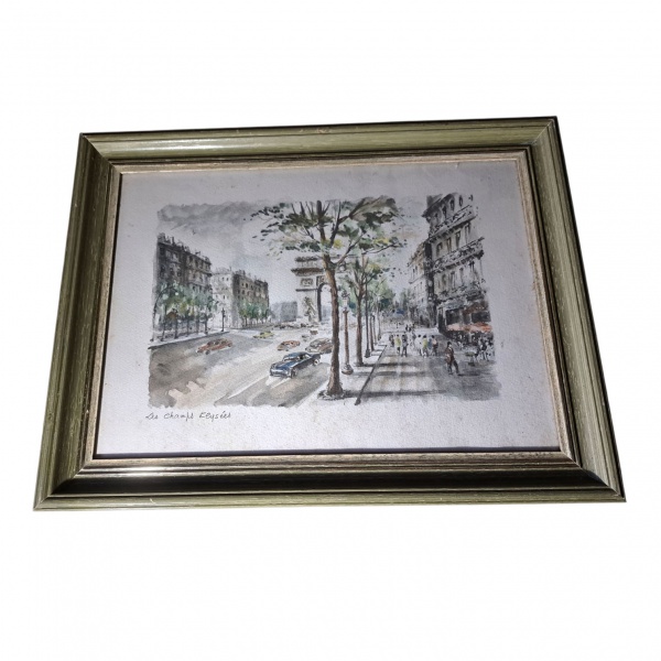 • Aquarela sobre cartão intitulada Les Champs Elysées, imperceptíveis marcas no cartão, 48 x 37 cm.