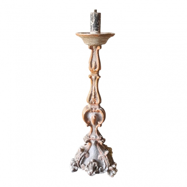 • Tocheiro em gesso para 1 vela, patinado apresenta desgastes na pátina,  Alt. 63, base 20 x 20 cm.