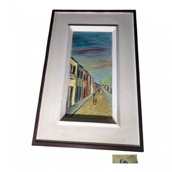 • EDA, Pintura sobre azulejo emoldurado representado casarios acid, 14 x 30 e  30 x 45 cm.
