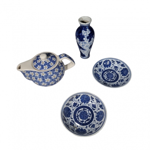 • Quatro peças em porcelana oriental sendo 1 bule para chá, 1 vaso e par de pratinhos, Alt. 10, Diam. 7 e Alt. 13, Diam. 5 cm.