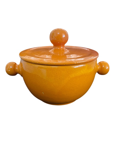 • Sopeira em cerâmica tonalidade laranja, marcado na base Duda. Apresenta leve lascado na tampa,  Alt. 16, Diam. 18 cm.