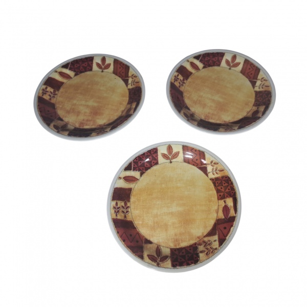 • Terno de pratos principais em porcelana decorados em policromia manufatura Oxford, um deles com leve bicado na borda, Diam. 26 cm.