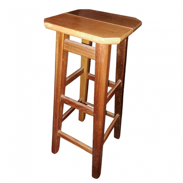 • Banco para bar, em madeira nobre tampo quadrangular com bodas oitavadas, pernas retas arrematadas em trava,  27 x 27, Alt. 74 cm