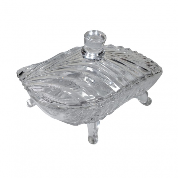 • Bombonière em cristal translúcido lapidado em formato de folha opiado em pés recurvos, 19 x 12, Alt. 15cm.
