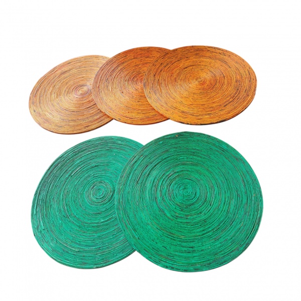 • Cinco jogos americanos executados em papier machê sendo 2 verdes e 3 laranjas, Diam. 32 cm.
