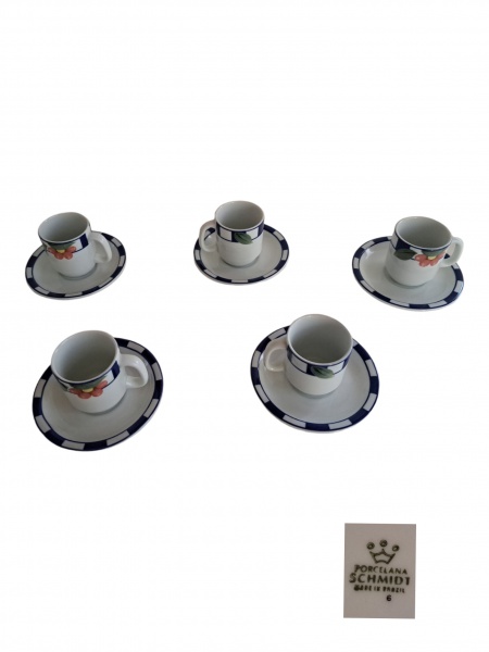 • Cinco xícaras para café com pires em porcelana Schmidt decorado com flores e bordas xadrez azul e branco, marcados na base, podem ir ao micro-ondas e máquina de lavar, 6 x 5, Diam. 11 cm.