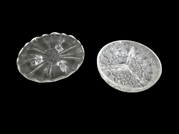 • Duas peças em vidro lapidado sendo uma bandeja para doces com bordas onduladas e pernas recurvas e uma travessa para petit fous com 3 divisórias, Diam. 18 e 20 cm.