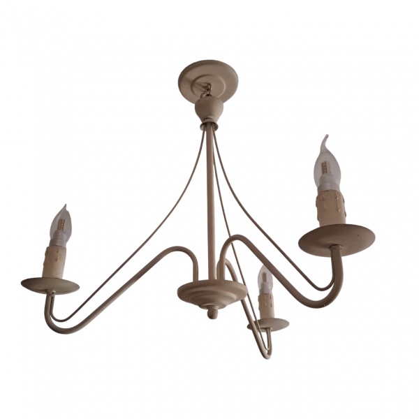 • Luminária de teto para 3 luzes em fer forget, braços recurvos patinado de branco, Alt. 58, Diam. 50 cm.