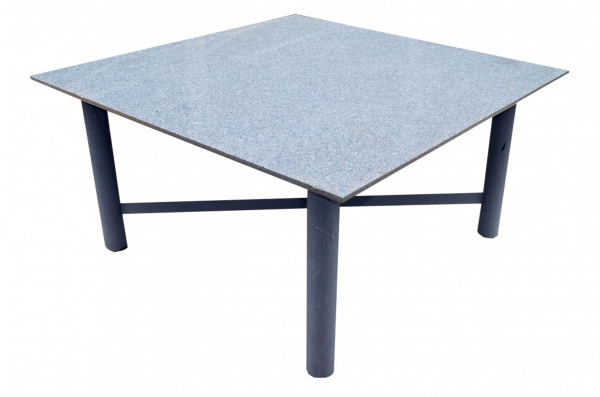 • Mesa com tampo de granito quadrangular apoiada em pernas de ferro cilíndricas patinadas na cor grafite arrematadas em trava, (Esta peça  encontra-se no Calembe - Petrópolis), 147 x 147 x 74 cm.
