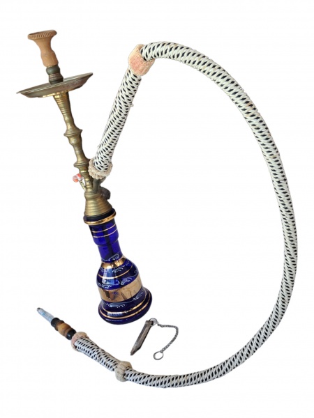 • Narguilé executado em cristal na cor azul  cobalto com bronze e metal dourado, mangueira revestida em corda com acabamentos com marcas do tempo, Alt. 70, Diam. 15 cm.