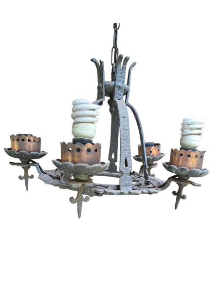 • Luminária de teto para 5 luzes em ferro representando coroa e cúpulas em cobre, Diam. E Alt. 30 cm.