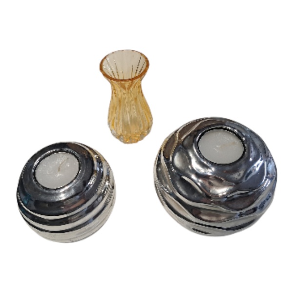 • Par de castiçal em metal prateado e solifleur em vidro lapidado amarelo, Alt. 10 a 9 cm.