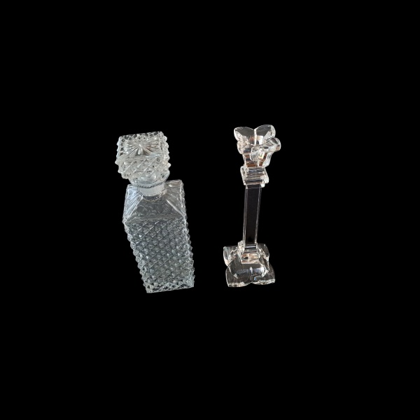 • Um castiçal pra uma vela em cristal translúcido e uma garrafa para whisky lapidação tijolinho, Alt. 25 cm.