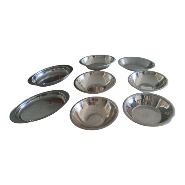 • Baixela em inox composta de 8 travessas  4 circulares e 4 ovais, 30 x 20 a 26 x 20 cm. Diam. 24 a 22 cm.