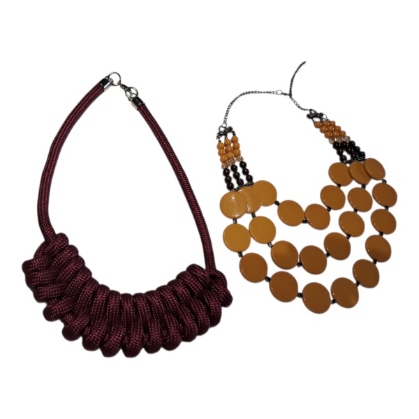 • Par de colares femininos, um em corda e outro em baquelite amarelo e metal.