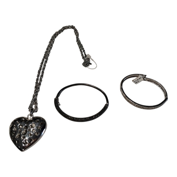 • Um cordão com pedantife representando coração em metal prateado e 2 pulseiras, a preta está com o fecho quebrado.
