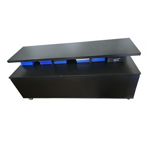 • Rack em MDF patinado de preto com um vão porta retrátil na parte inferior com prateleira interna, apoiado em rodízios, 129 x 39, Alt. 54 cm.