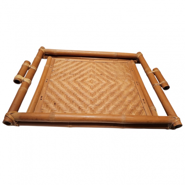• Bandeja executada em bambu, fundo trançado, 37 x 46 cm.