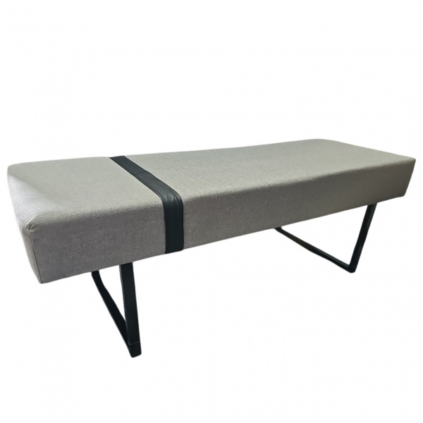• Pufe  em algodão na cor grafite, cinturão de couro, laterais em madeira patinada de preto vazada, Com. 125, Prof. 45, Alt. 54 cm.