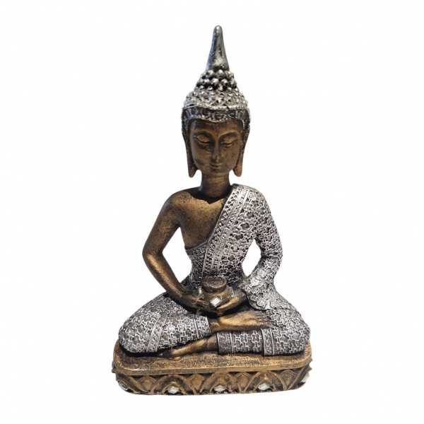 • Escultório representando Buda Hindu em meditação apoiado em base decorada com vidrilhos, 13 x 9, Alt. 22 cm.