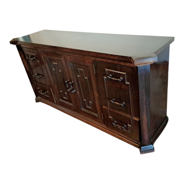 • Arca aparador em madeira nobre, tampo apoiado em corpo retangular, seis gavetas laterais, 2 portas centrais com prateleira interna, 188 x 48, Alt. 89 cm.
