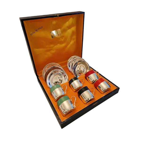 • Seis xícaras em porcelana Steatita coloridas e com frisos dourados, suportes e pires espessurados à prata Wolf, 5 x 5 cm.