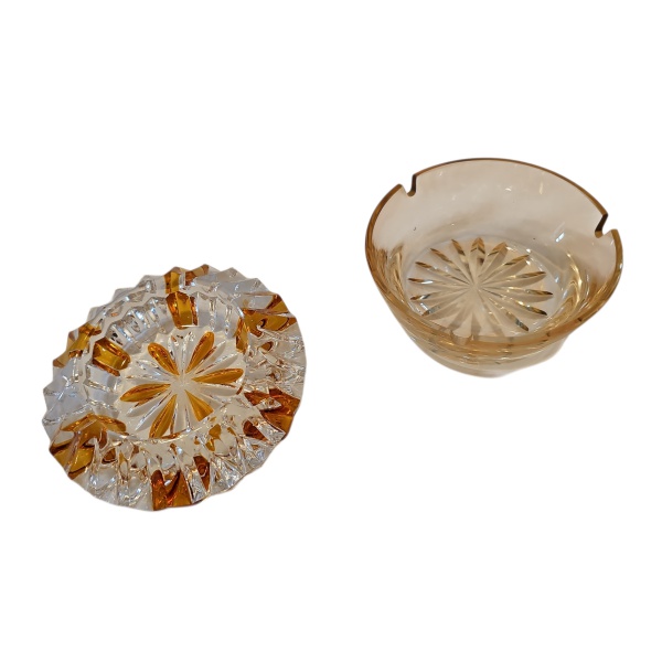 • Dois cinzeiros em cristal sendo um doublé amarelo de outro amarelo, Diam. 14 e 12 cm.