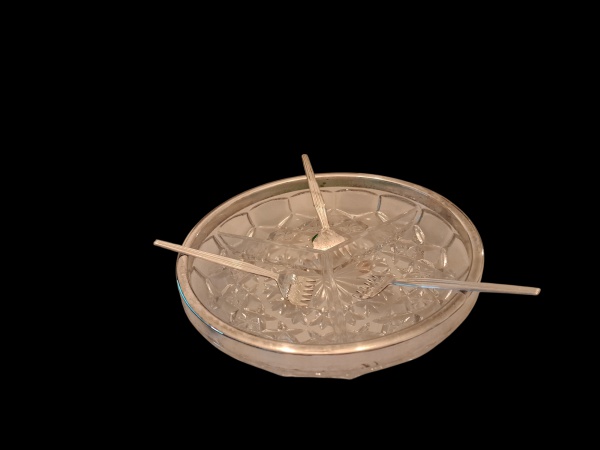• Travessa em cristal com três divisórias, bordas prateadas e 3 garfinhos, 21 x 5 cm.